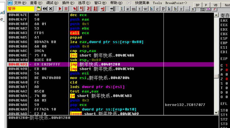 用OD打开,Ctrl+F搜索popad找到下面最近的一个jm指令行,按F2下断点(下断点后左侧对应的二进制地址会变红),再按F9将程序执行到这里(左侧对应的二进制地址会变灰)