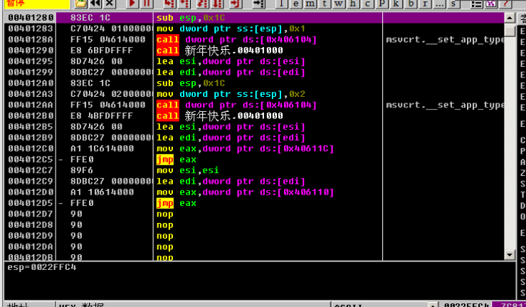 然后再按F8执行这一条jm语句,会跳转到OEP的位置如图就是OEP的位置了