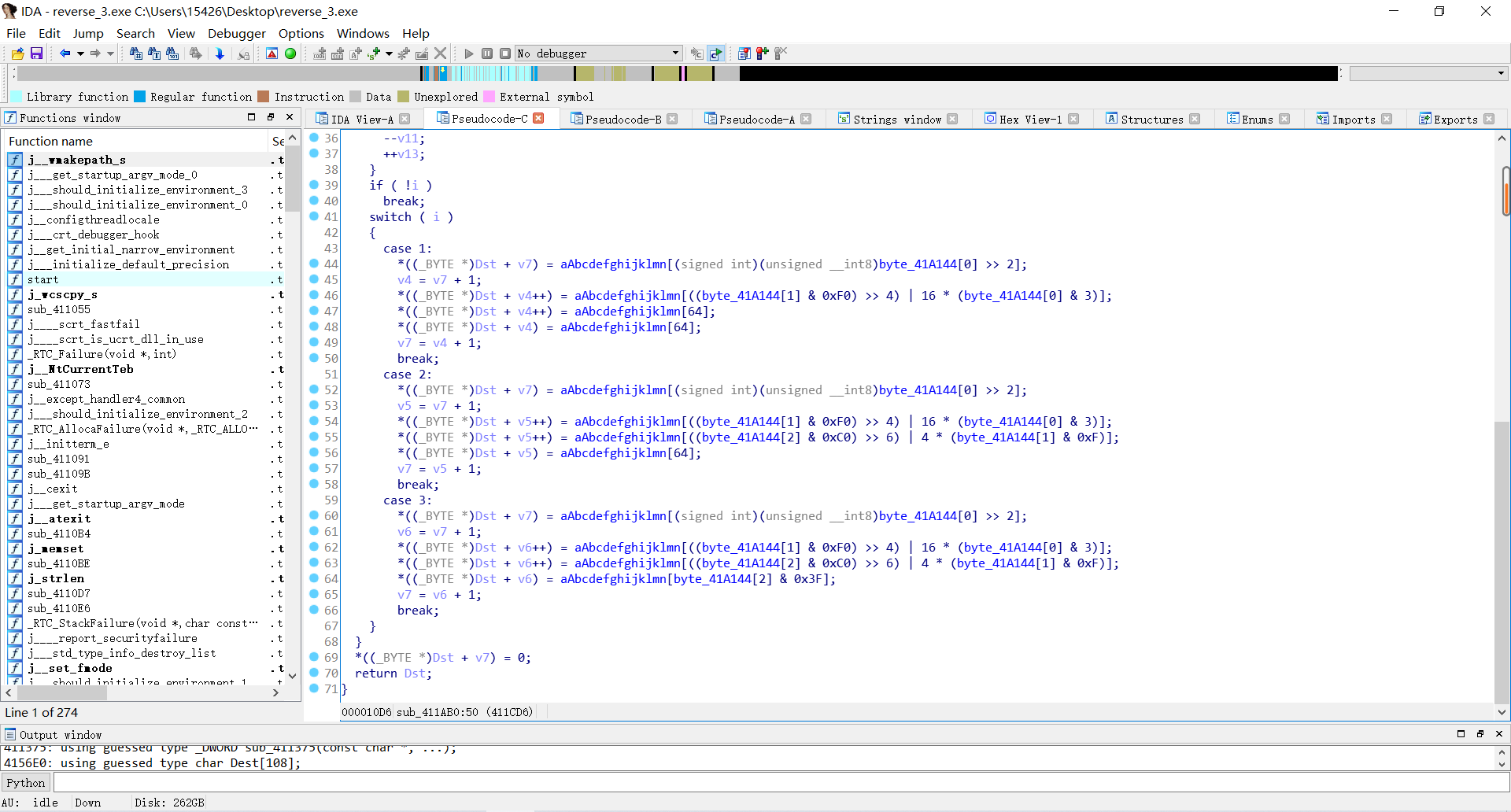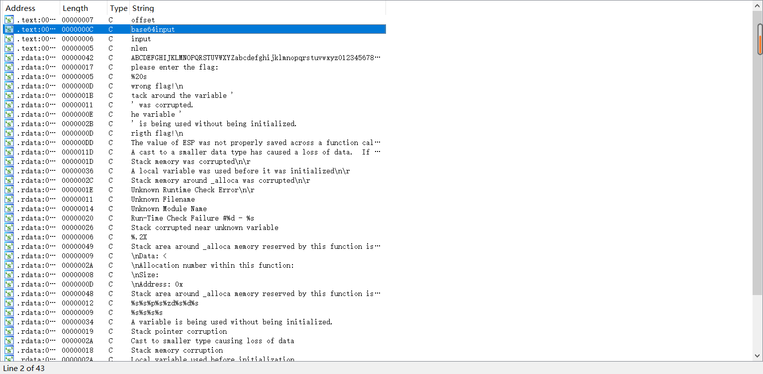 .rdata:00417B30 aAbcdefghijklmn db 'ABCDEFGHIJKLMNOPQRSTUVWXYZabcdefghijklmnopqrstuvwxyz0123456789+/='联想到开头查看字符串发现的这个怀疑这一串是base64编码