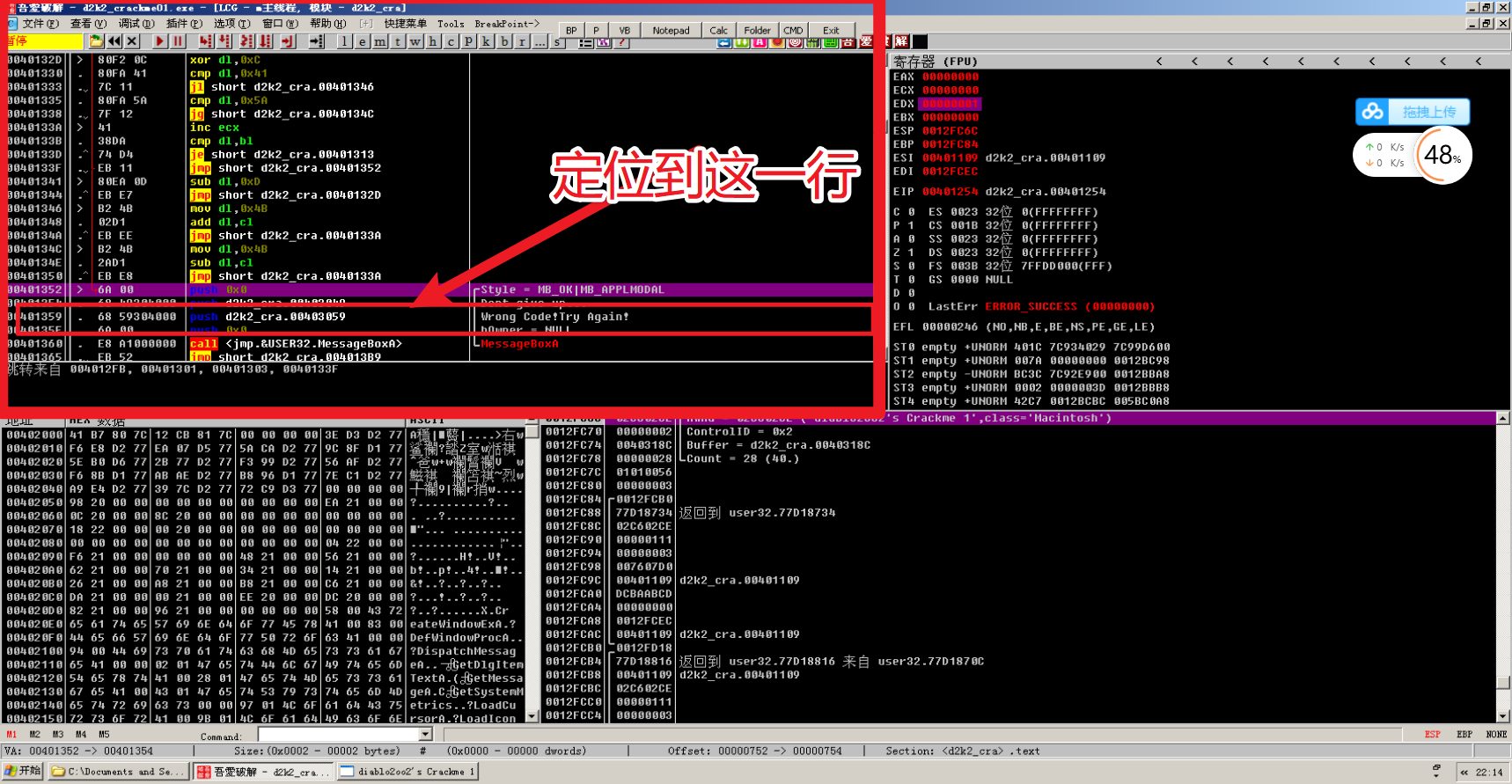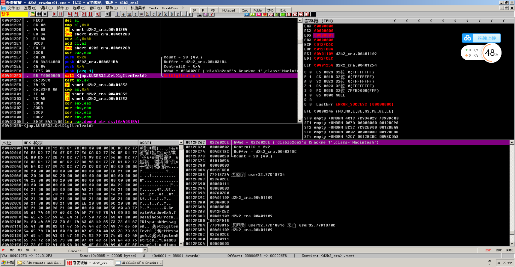 找到跳转来自哪(因为要找关键call,本题按照程序逻辑就是找获取文本框的两个函数call)找到的第二个获取文件文本函数的call(GetDlgItemTextA 是c语言中的一个获取数据流的一个函数)。为了方便后续分析我下了一个断点(F2)。