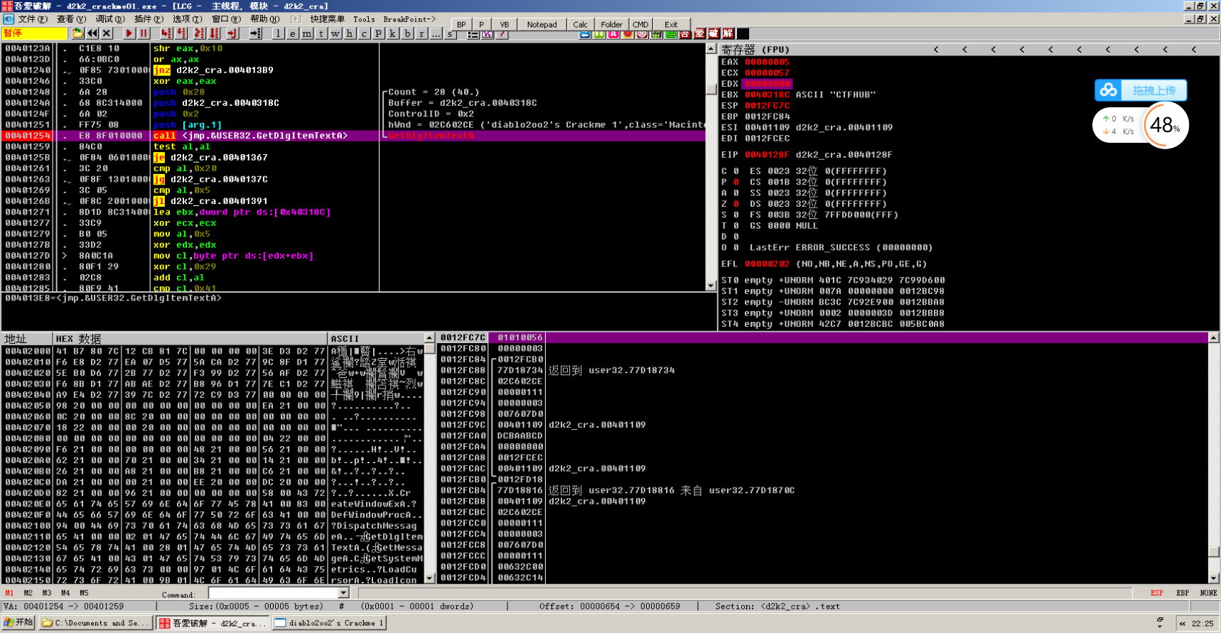 然后点确认后程序会停在第一个断点处也就是第一个获取ID中,然后单步执行结合汇编代码阅读和输入的用户名CTFHUB来理解