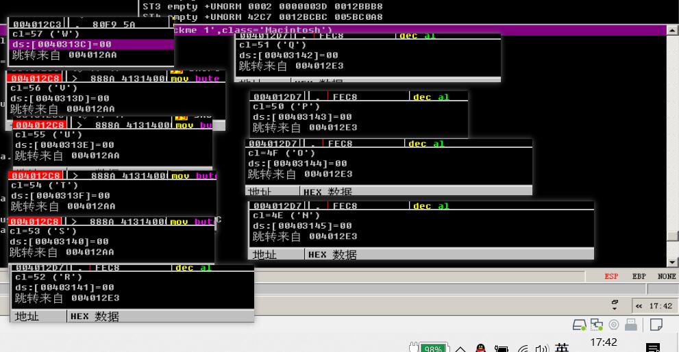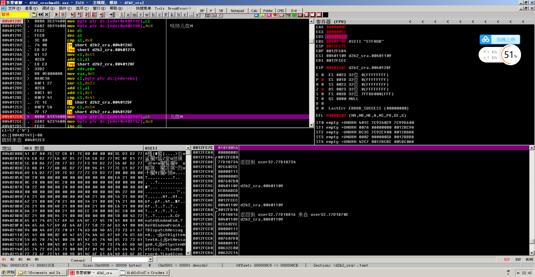 发现这两者之间大致是将CTFHUB一个个读入cl然后经过一系列变换最后存入两个数组(这两个数组地址连续很可能是一个数组从40313C到403145十个ascii码),然后就到获取注册码文本框文本的call了,因此在两个保存数值处下断点