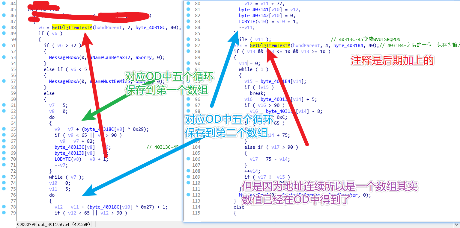 byte_40313C就是那个加密过后储存的十个字符的数组啦byte_4031B4就是输入的验证值保存的数组