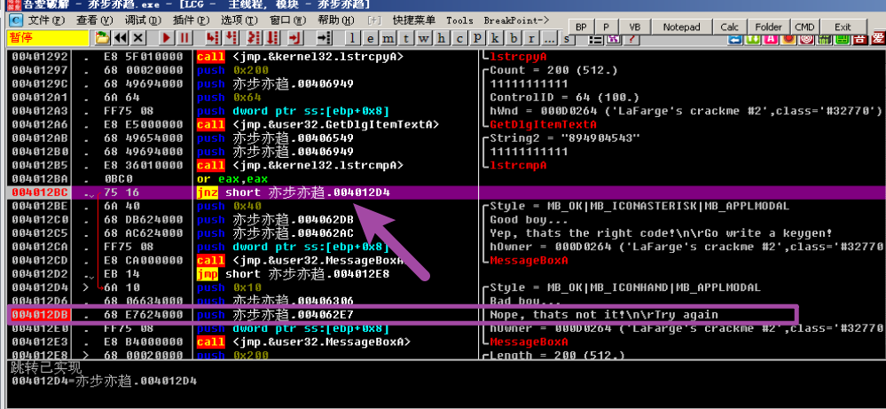 通过关键字找到对应行,并向上找到关键函数,然后发现调用关键函数前push了两个string猜测可能是相关的。然后在条件调转处下了一个断点(或者上面的那个关键call此处按照程序基本逻辑应该就是获取注册码后进行的比对操作了),然后F9运行,输入