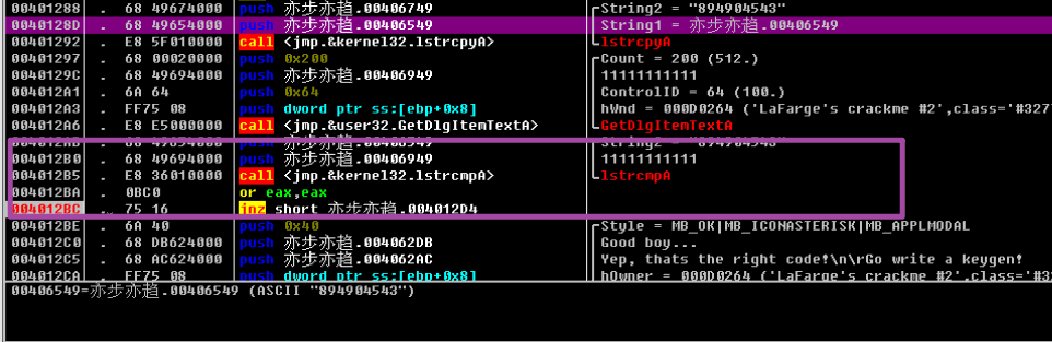 再按F9运行到断点处发现string1和string2被赋值,并且在关键call前push保存了各自的值分别是